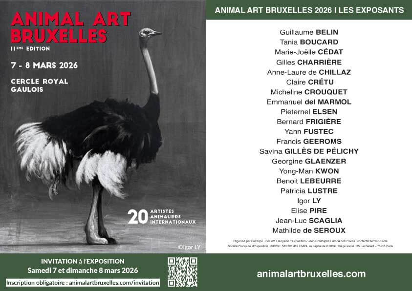 Mes expositions Retrouvez mes expositions à venir Exposition "Le temps des Flocons" du 18 janvier au 1er mars à la Galerie Rive mauve Meung sur Loire Pour la 12ème année consécutive, je participe à Animal Art Bruxelles, au Cercle gaulois, du 5 au 8 mars 2026 Si vous désirez assister a l'avant-Première ou au vernissage, contactez moi . Retrouvez mes expositions récurrentes ANIMAL ART PARIS Salon International des artistes animaliers contemporains Hippodrome d’Auteuil SALON D'ART INTERNATIONAL Exposition Biennale de Saint-Pierre Lès Nemours (77) ANIMAL ART BRUXELLES Salon International des artistes animaliers contemporains Bruxelles SALON DE LA CHASSE ET DE LA FAUNE SAUVAGE Salon de la Chasse et de la Faune sauvage à Mantes la Jolie (78). GAME FAIR Parc Equestre fédéral de Lamotte-Beuvron.
